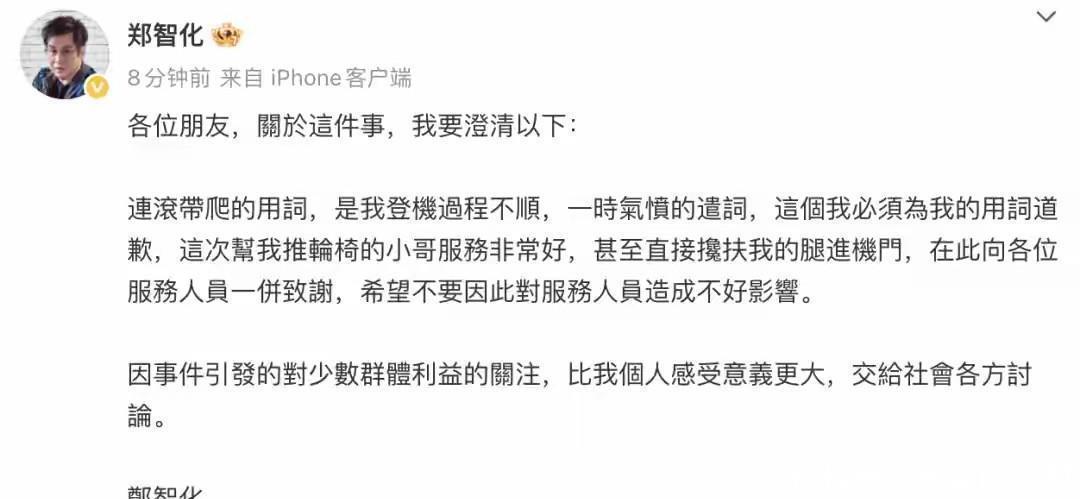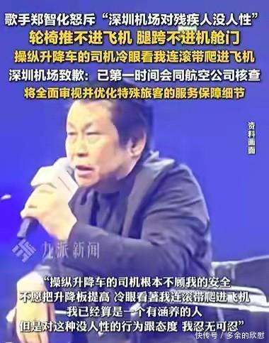 前几天,郑智化在社交平台上发声,狠批深圳机场的服务差得让人无法忍受,完全没有人情味,对残疾人的困难置之不理,气得他不得不爬着进飞机。机场方面看到后,立刻就出来道歉了。